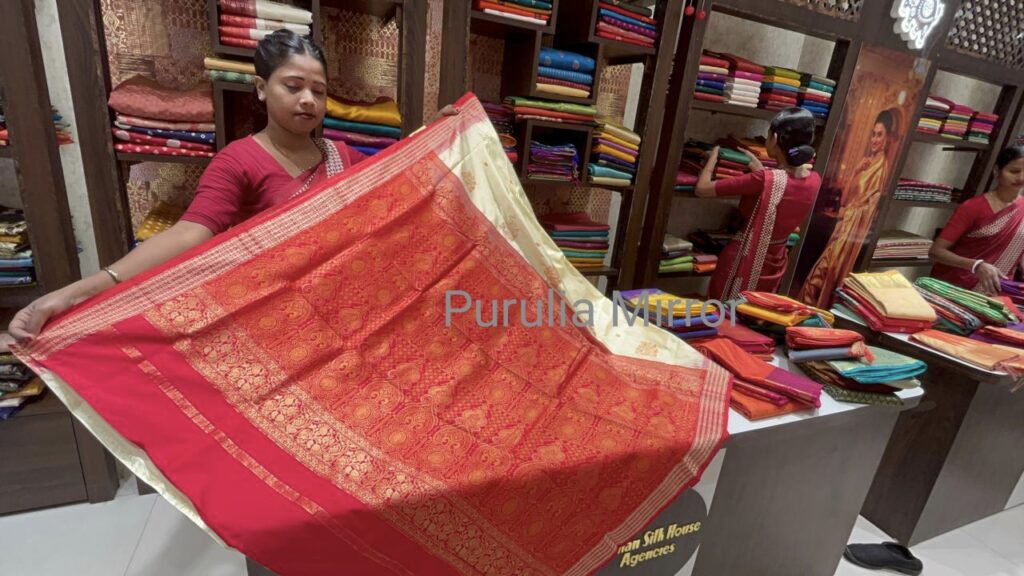 অঞ্জলি ছাড়া পুজোর সকাল ভাবাই যায় না। আর অঞ্জলির জন্য পুরুলিয়ায় এ বছর জমকালো অফ হোয়াইট বোমকাই শাড়ির কদরই বেশি। সঙ্গে অবশ্যই পাঞ্জাবি। সদর থানার উল্টোদিকের বাজারে সারি সারি পাঞ্জাবির দোকানে রবিবার দুপুরেও গিজগিজ করছে ক্রেতা। সেখানকার বিপণি-মালিক মনোজকুমার গুপ্তা বলেন, “পুরুলিয়ায় সেভাবে পাঞ্জাবি বিক্রি হতো না। ২০২১ সাল থেকে পাঞ্জাবির বিক্রি বেশ ভালো। তাই প্রচুর কালেকশন নিয়ে এসেছি আমরা।”