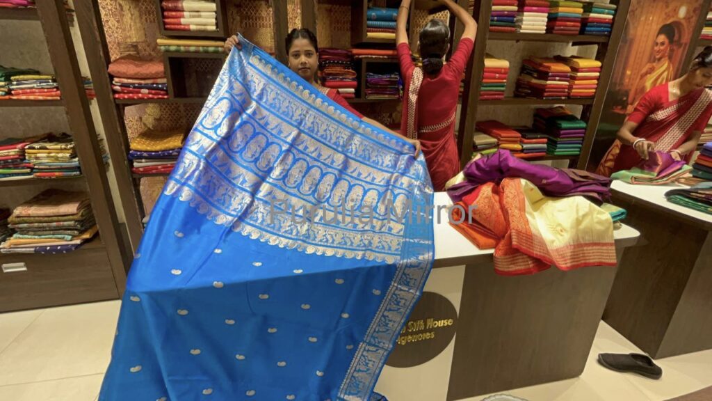 শাড়ির বাজারে এখন ট্রেন্ডিং ফ্যান্সি আর ট্র্যাডিশনালের মিশ্রণ। টিশু ক্রাস টিশু, অরগেঞ্জা, কোরা, দোপিয়েন, মসলিনের ভিড়ে পাল্লা দিয়ে চলছে পৈঠান, কাঞ্জিভরম, কাতান, তসর ঘিচা। দেশবন্ধু রোডের একটি নামকরা শাড়ির দোকানে দাঁড়ালেই বোঝা যায় কেমন ভিড়। সেখানকার কর্মী নাজ পরভিন ও বিজয় নন্দী বললেন, “এই রবিবার থেকেই ভিড়টা সবে শুরু হলো। আসলে সরকারি কর্মচারীদের অনেকেরই বেতন হয়ে গিয়েছে তো। আমাদের বিপণিতে ট্র্যাডিশনাল শাড়ির বিক্রি সবচেয়ে বেশি। তবে ফ্যান্সি শাড়ির বিক্রিবাটাও এবার বেশ ভালো।”