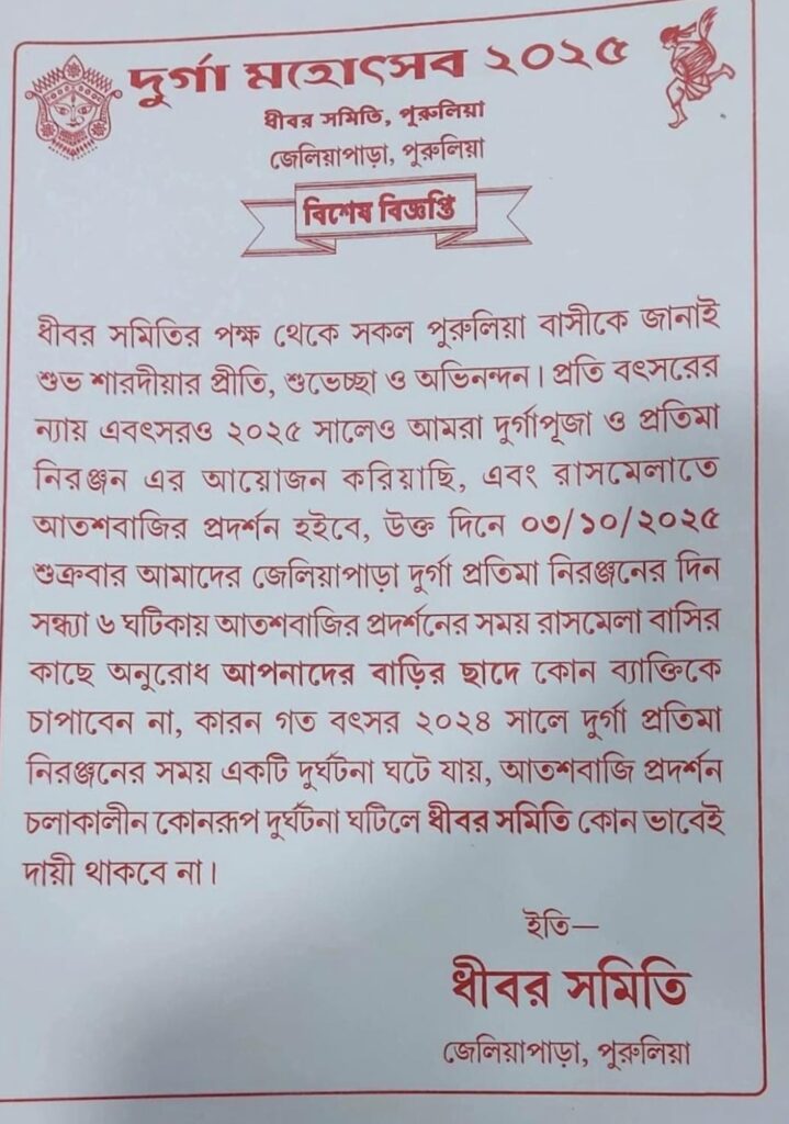 সেই বিজ্ঞপ্তিতে স্পষ্ট জানানো হয়েছে— ছাদ বা বারান্দায় কাউকে ভিড় করতে দেওয়া যাবে না। কোনও দুর্ঘটনা ঘটলে তার দায় উদ্যোক্তারা নেবেন না। সমিতির সেক্রেটারি চন্দ্রচূড় ধীবর জানান, ‘‘গতবারের অভিজ্ঞতা আমাদের চোখ খুলে দিয়েছে। তাই কোনওরকম ঢিলেমি নেই। আজ বিকেলেই আতশবাজি ও বন্যঢ্য শোভাযাত্রার মধ্য দিয়ে প্রতিমা বিসর্জন সম্পন্ন হবে।’’