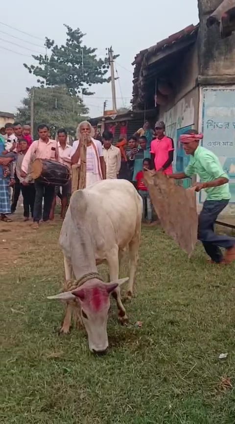 স্থানীয় সূত্রে জানা গিয়েছে, এদিন সকাল থেকে গরুর গোয়ালঘরে চলে বিশেষ পুজো। গরুর মাথায় ধানের মুকুট পরানো হয়, শরীরে রঙিন ছাপ দেওয়া হয়। এরপর গরুকে খুঁটায় বেঁধে ঢোল, ধামসা, মাদলের তালে তালে হয় ‘গরু খুঁটানো’। গ্রামের মহিলারা গরুর কপালে সিঁদুর পরিয়ে দেন, পুরুষেরা খুঁটানোর কাজে যোগ দেন।