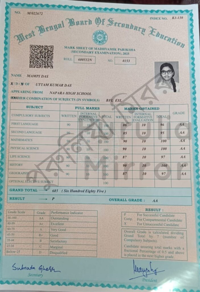 বাংলায় ৯৬, ইংরেজিতে ৯৫, অংকে ১০০, ভৌত বিজ্ঞানে ১০০, জীবন বিজ্ঞানে ৯৭, ইতিহাসে ১০০ ও ভূগোলে ৯৭ পেয়েছে মাম্পি।