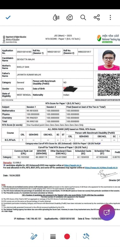 এই পরীক্ষার প্রথম সেশনে জানুয়ারি মাসে পশ্চিমবঙ্গ থেকে প্রথম স্থান অধিকার করে নিয়েছিল সে। তার বাড়ি পুরুলিয়া জেলার আড়ষা থানার জামবাদ গ্রামে। সেবার তাঁর প্রাপ্ত পার্সেন্টাইল ছিল ৯৯.৯৯৯২১। আর এবার তার এন টি এ স্কোর একশো।