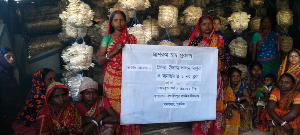 আয়ের নতুন দিশা দেখাচ্ছে মাশরুম চাষ। পুরুলিয়া জেলা উদ্যান পালন দপ্তর এবং মানবাজার ১ নং ব্লক প্রশাসনের সহযোগিতায় ৫০০ সিলিন্ডার মাশরুম চাষ করে তাক লাগালো খুদেরা। গোবিন্দপুর প্রাথমিক বিদ্যালয়ের পড়ুয়ারা ও পড়ুয়াদের মায়েদের কায়িক শ্রমে প্রথম দফায় প্রায় ১৫ কুইন্টাল মাশরুম তোলা হলো এই উৎপাদন ক্ষেত্র থেকে। এর পর আরও দুই দফায় আরো বেশ কয়েক কুইন্টাল মাশরুম মিলবে বলে জানান উদ্যান পালন দপ্তরের জেলা উদ্যান পালন আধিকারিক ড. কৃষ্ণেন্দু নন্দন। প্রকল্পের দায়িত্বে থাকা দুই আধিকারিক অসীম মিশ্র ও সঞ্জীব মাহাতো জানান, দরিদ্র মায়েদের বিকল্প রোজগারের দিশা দেখাতে এই উদ্যোগ নেওয়া হয়েছে।