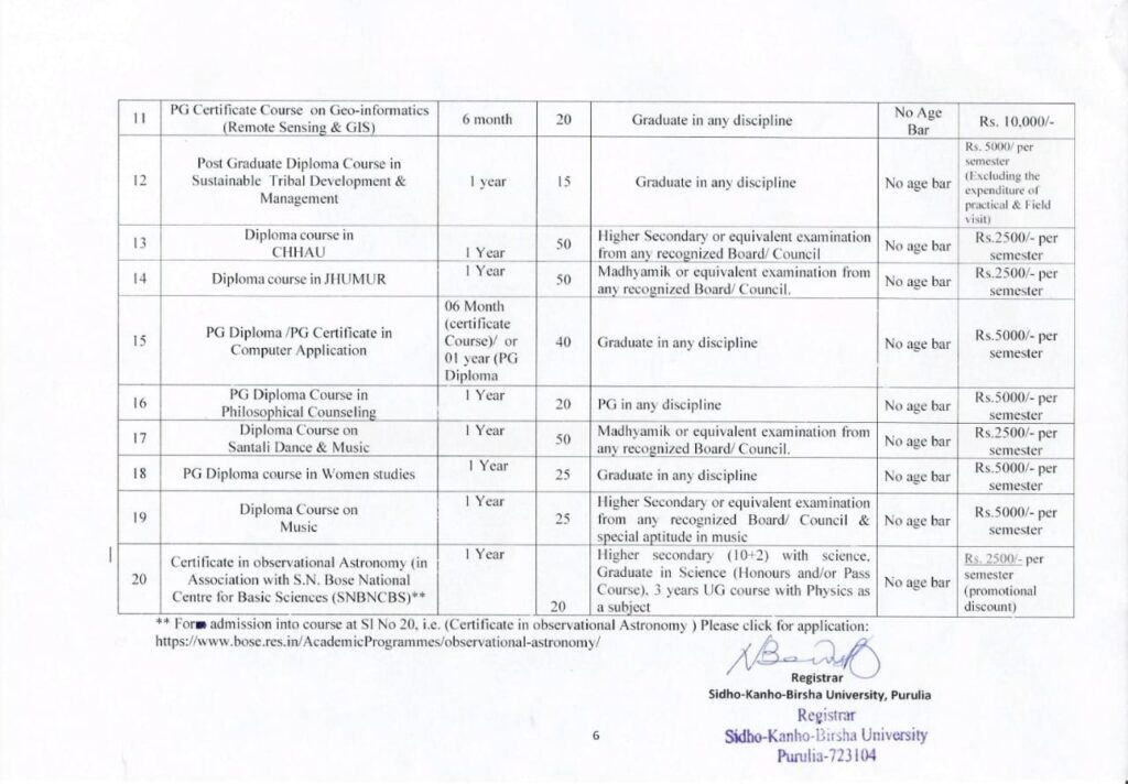 এছাড়া অবজারভেশনাল অ্যাস্ট্রোনমি, ওয়েব অ্যান্ড ওয়েব বেসড অ্যাপ্লিকেশন, সান্থালি স্ক্রিপ্টোগ্রাফি বিষয়গুলোতে আছে সার্টিফিকেট কোর্স৷ ইনকামট্যাক্স প্রসিডিওর, জিএসটি বিষয়ে সার্টিফিকেট ও ডিপ্লোমা দুইই করা যেতে পারে। আর রয়েছে ছৌ,ঝুমুর বিষয়ে ডিপ্লোমা করার সুযোগ। বিজ্ঞপ্তিতে জানানো হয়েছে আবেদনের জন্য কোন পয়সা লাগছে না।