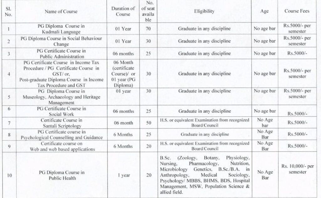 কুড়মালি, সোশ্যাল বিহেভিয়ার চেঞ্জ, পাবলিক হেলথ, ট্রাইবাল ডেভেলপমেন্ট, কম্পিউটার অ্যাপ্লিকেশন, ফিলজফিক্যাল কাউন্সেলিং, ওম্যান স্টাডিজ বিষয়গুলি নিয়ে পড়া যাবে পোস্ট গ্র্যাজুয়েট ডিপ্লোমা কোর্স।