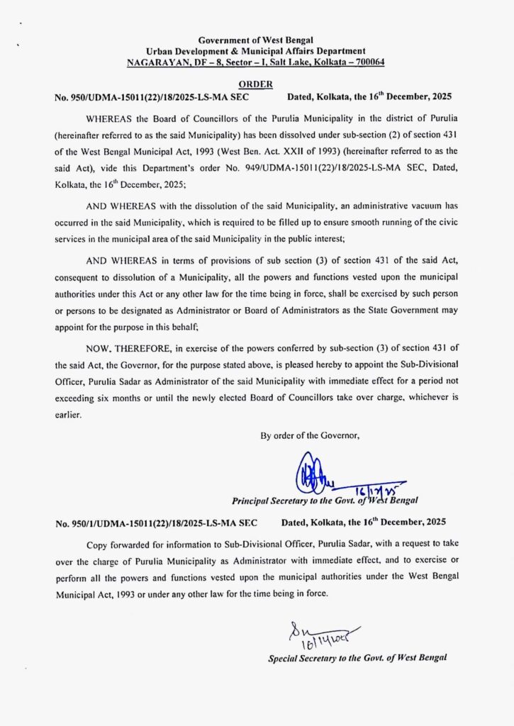 নির্বাচিত পুরুলিয়া পুরসভাকে ভেঙ্গেই দিল প্রশাসন। ‘পুরুলিয়া মিরর’ আগেই জানিয়ে দিয়েছিল প্রশাসক কোন রাজনৈতিক ব্যক্তি নন, হবেন পুরুলিয়ার মহকুমা শাসক। হলও ঠিক তাই। পুরুলিয়া পুরসভার প্রশাসক হলেন পুরুলিয়া সদর মহকুমা শাসক উৎপল কুমার ঘোষ।