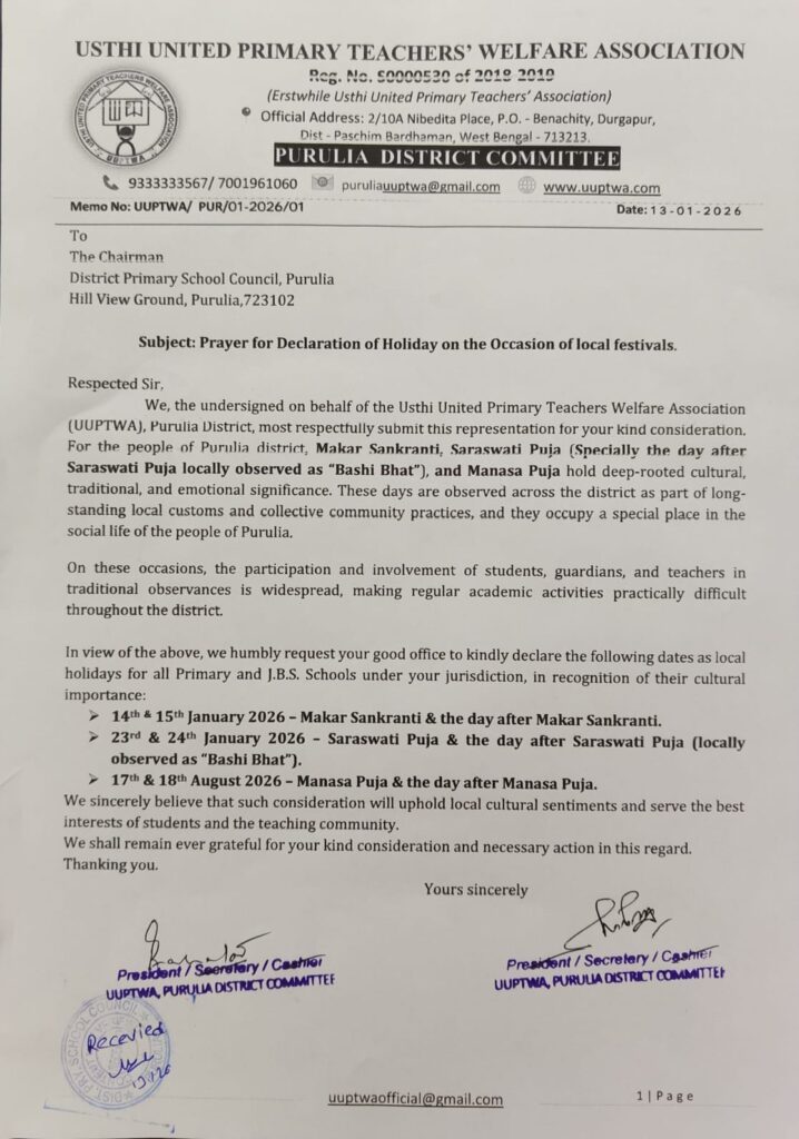 উস্থি ইউনাইটেড প্রাইমারি টিচার্স ওয়েলফেয়ার অ্যাসোসিয়েশন মঙ্গলবার চিঠি দিয়েছে চেয়ারম্যানকে। তাতে মকর, আখ্যান যাত্রা, সরস্বতী পূজার পরের দিন বাসি ভাত, মনসা পূজা ও পান্নার দিনে পূর্বেকার মতো স্থানীয় ছুটি দেওয়ার আবেদন জানানো হয়েছে।