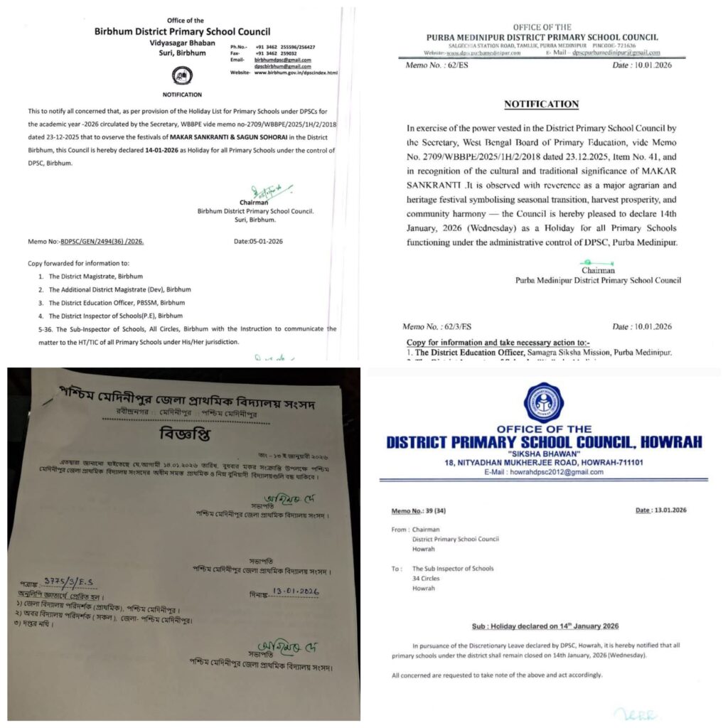 পুরুলিয়ার বৃহত্তম পার্বণ মকর পরবে ছুটি থাকছে না কচিকাঁচাদের স্কুল। নজিরবিহীন ভাবে ছুটি দিলো না জেলা প্রাথমিক শিক্ষা সংসদ। রাজ্য শিক্ষা দফতরের ফতোয়ার কাছে কার্যত অসহায় পুরুলিয়ার সংস্কৃতি। অথচ মকরে ছুটি দেওয়া হয়েছে পশ্চিম মেদিনীপুর, পূর্ব মেদিনীপুর, বীরভূম এমনকি কলকাতার পার্শ্ববর্তী জেলা হাওড়া জেলা প্রাথমিক শিক্ষা সংসদ দ্বারাও। অথচ শিক্ষা দপ্তরের তুঘলকি সিদ্ধান্তের সামনে অসহায় পুরুলিয়া জেলা শিক্ষা সংসদ।