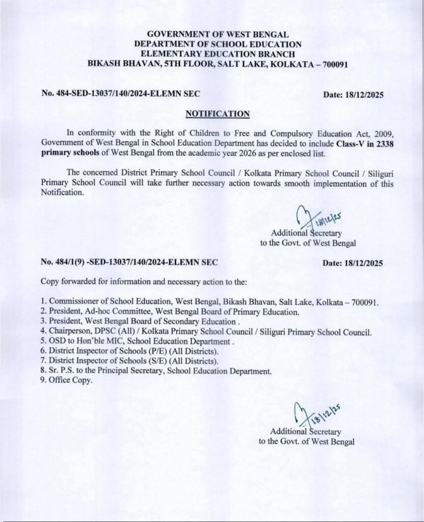 প্রাথমিক শিক্ষার পরিধি বাড়াতে রাজ্য শিক্ষা দপ্তর ২০২৬ শিক্ষাবর্ষে রাজ্যজুড়ে ২৩৩৮টি প্রাথমিক বিদ্যালয়ে পঞ্চম শ্রেণি চালুর অনুমোদন দিয়েছে। এই উদ্যোগের প্রস্তাব রেখেছিল প্রাথমিক শিক্ষা পর্ষদ। অনুমোদিত তালিকায় স্থান পেয়েছে পুরুলিয়া জেলার ২০টি প্রাথমিক বিদ্যালয়। ফলে ওই স্কুলগুলিতে আগামী শিক্ষাবর্ষ থেকেই পঞ্চম শ্রেণি চালু হচ্ছে।
